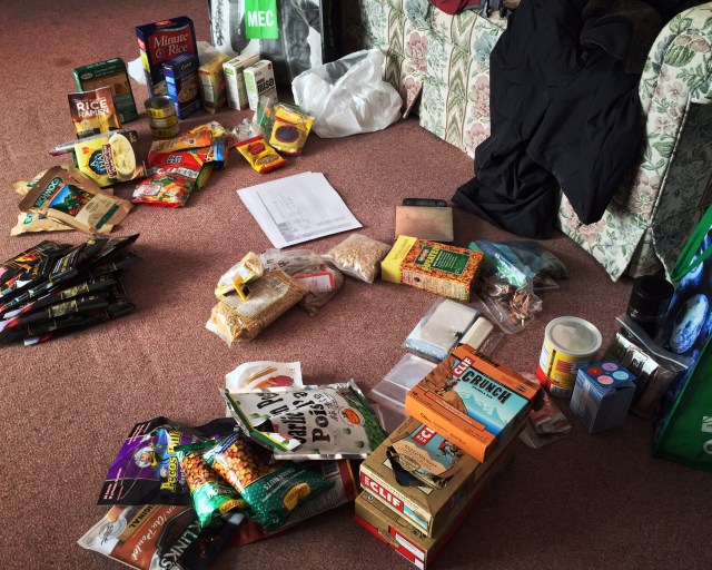 Only part is actually spread out — just the food I’ve accumulated so far. It seemed like an appropriate time for an inventory. I figure I’ll need something like 30 breakfasts and 30 dinners as well as 268 snacks for the 40 days.