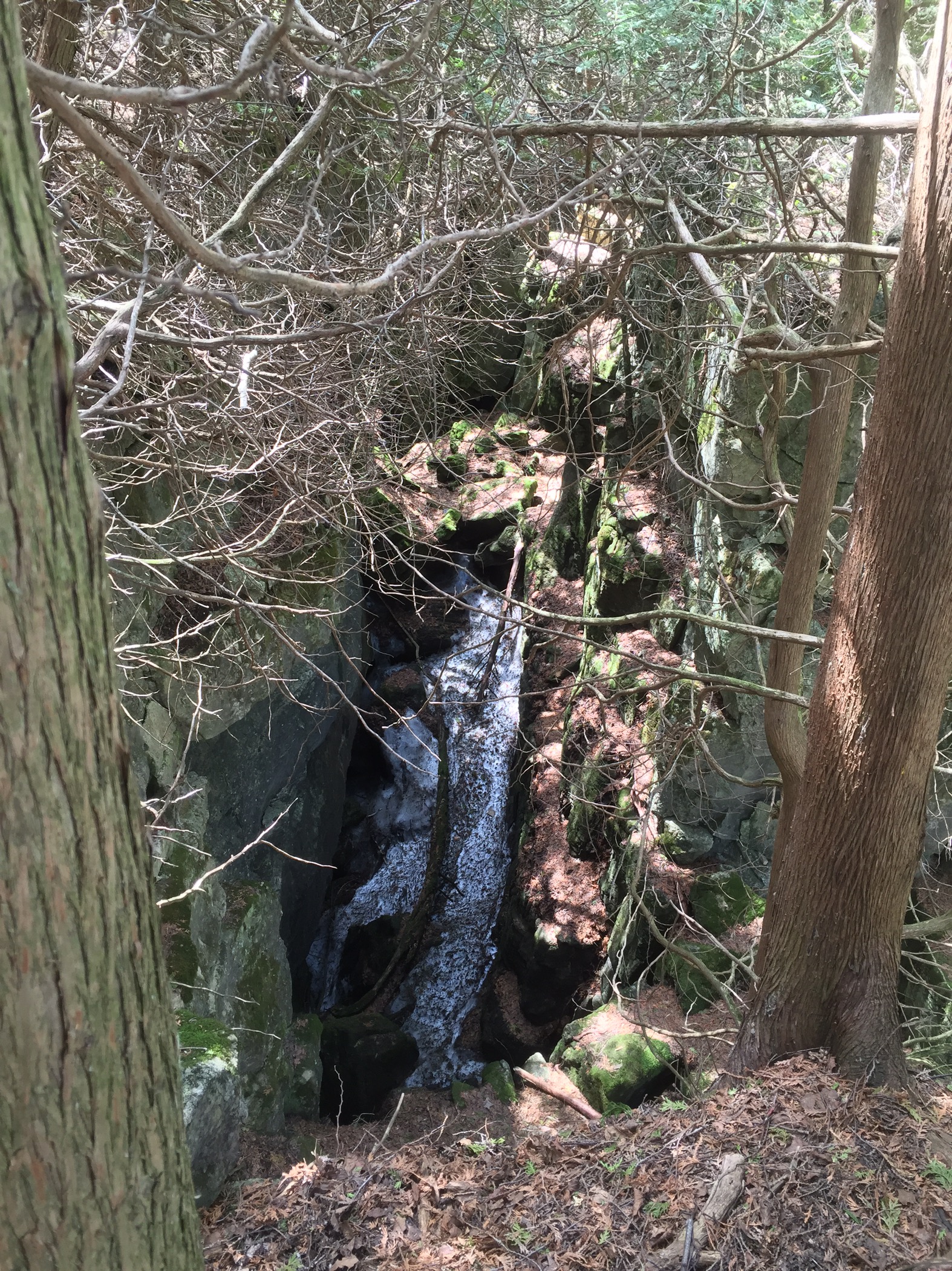 Today we did 23 kilometres. There were several spots where perhaps a couple of hundred metres involved attentive pole work to scramble up and down gashes of rock that were exposed beneath the huge piles of glacial drift. But most of the walk was across rolling hills of what I presume is the Singhampton and Gibraltar Moraines. Yesterday and today, the map showed kilometer after kilometre of road walking. What most of it turned out to be was hard sandy Mulmur backroads carved straight out of sandy debris dropped as terminal and interlobate moraines by the retreating glaciers of 13,500 years ago as they melted away. One of the most striking such sections was several kilometres along the old Hurontario Street planned to be the military road from Lake Ontario to Georgian Bay. In several places the piles of rock along the side of the Hurontario Street were clearly boulders dragged out of the roadway to even the surface, instead of the far more common stone fences associated with field clearing. We travelled back and forth WHS (West of Hurontario Street) and EHS (East of Hurontario Street) as well as directly on Hurontario Street. (I live on the Second Line WHS farther south in Orangeville.) The highlight of this long and softly pleasant road walking was having a snack at the old narrow military bridge where Hurontario Street crosses a tributary of Blsck Bank Creek just above a pretty little waterfall.