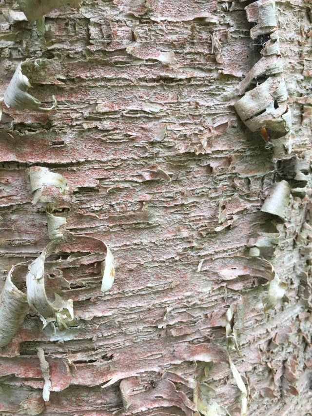 Pink algae on White Birch, where acild fog issues year-round from a karst cave in the Wodehouse area