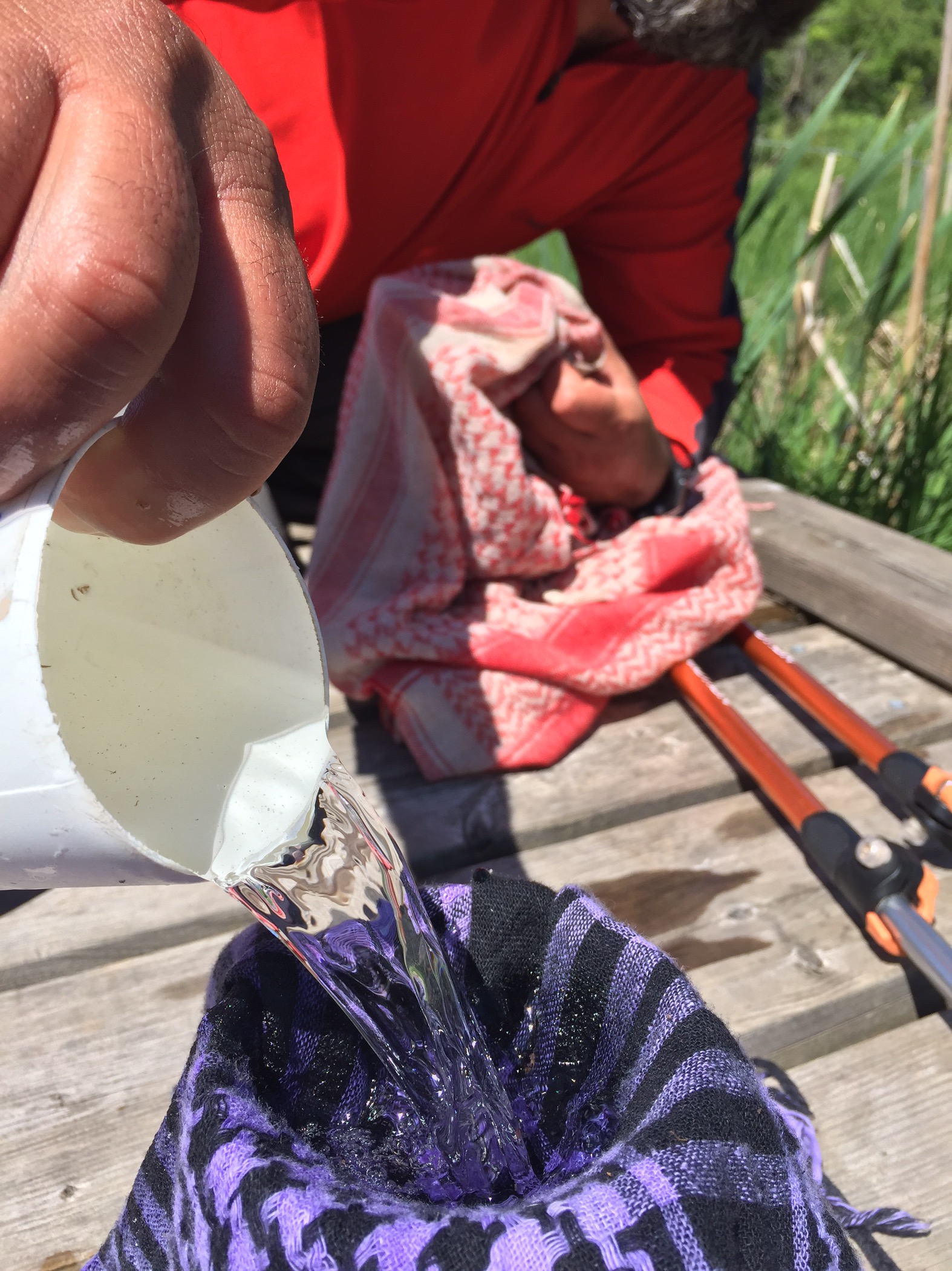 One of the stories is that we found water. Three places come to mind. One was a merest trickle flowing through a cattail marsh. We removed the ‘woodsies, crudsies and fausties’ by coarsely  filtering through a corner of our shemaghs, and then applying our personal treatment approaches. Kookork used his Sawyer Squeeze filter. I double-treated mine with my UV SteriPen.