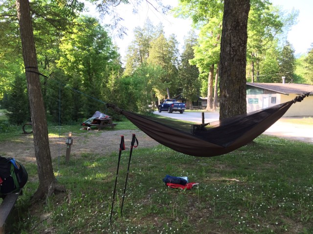 The third was the downtown Owen Sound municipal campground, staffed with the most welcoming gentleman. The most amazing part was that the water taps were so high up that the water poured over my (tall) head — and came in the choice of two temperatures! Oh my! They also had big white metal boxes that sloshed water onto our hiker clothes and spit them out perfumed and dry. Whee! (We — temporarily! — don’t stink.)