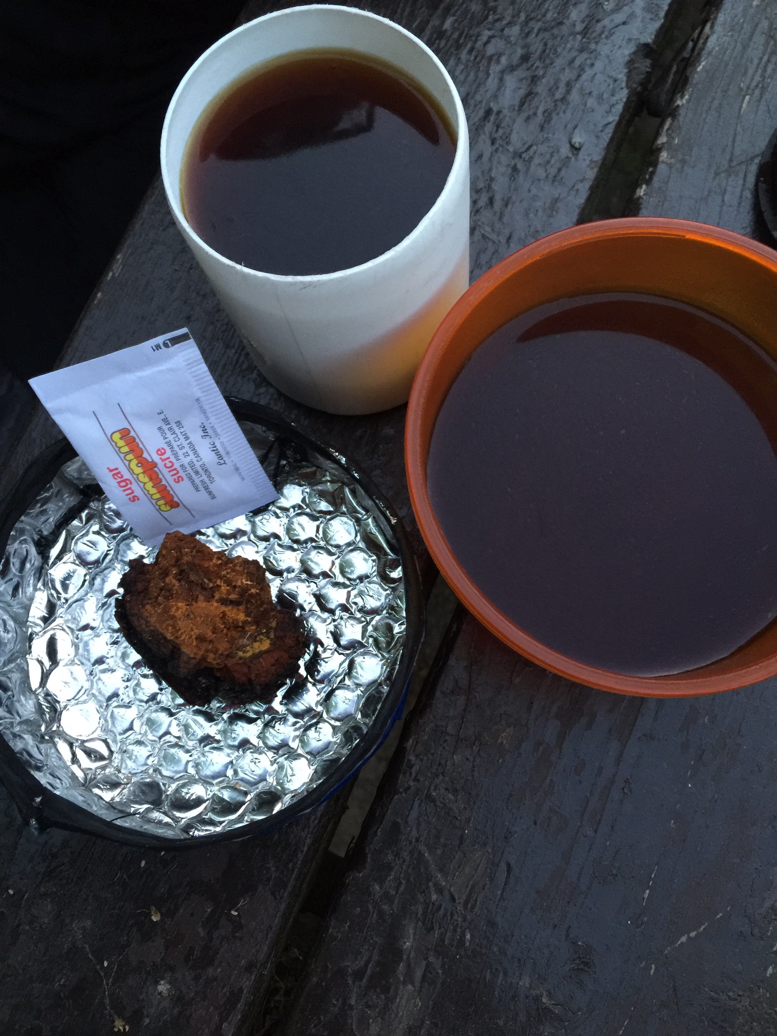 • We found some ‘chaga’ fungus, Inonotus obliquus, and boiled it into a very pleasant tea (served with sugar).  The purported and unproven medical benefits are evidently destroyed and made unavailable by our (standard) method of pounding the fungus and briefly boiling it.