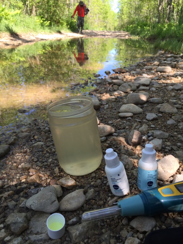 Water is scarce here. It’s amazing to me how few people seem to be home in the few houses we pass during the day. We filled up this morning at a farmhouse near our start. And I’m glad we did. We saw one person at home the rest of the day — and didn’t ask for water … There were sloughs along the way, but they weren’t very appealing. Finally we decided we needed at least some safety water to carry in abeyance for the morning. A puddle in the middle of a dirt road represented the best — and last — hope before the long upland section in which we were planning on camping. Fortunately, we each got a litre before a car came and mixed the mud and the frogs up. I pulled out my chlorine dihydroxide drops and double-treated my litre — and then boiled it before rebuilding it as supper water for our evening soup. Hhmmhh …
