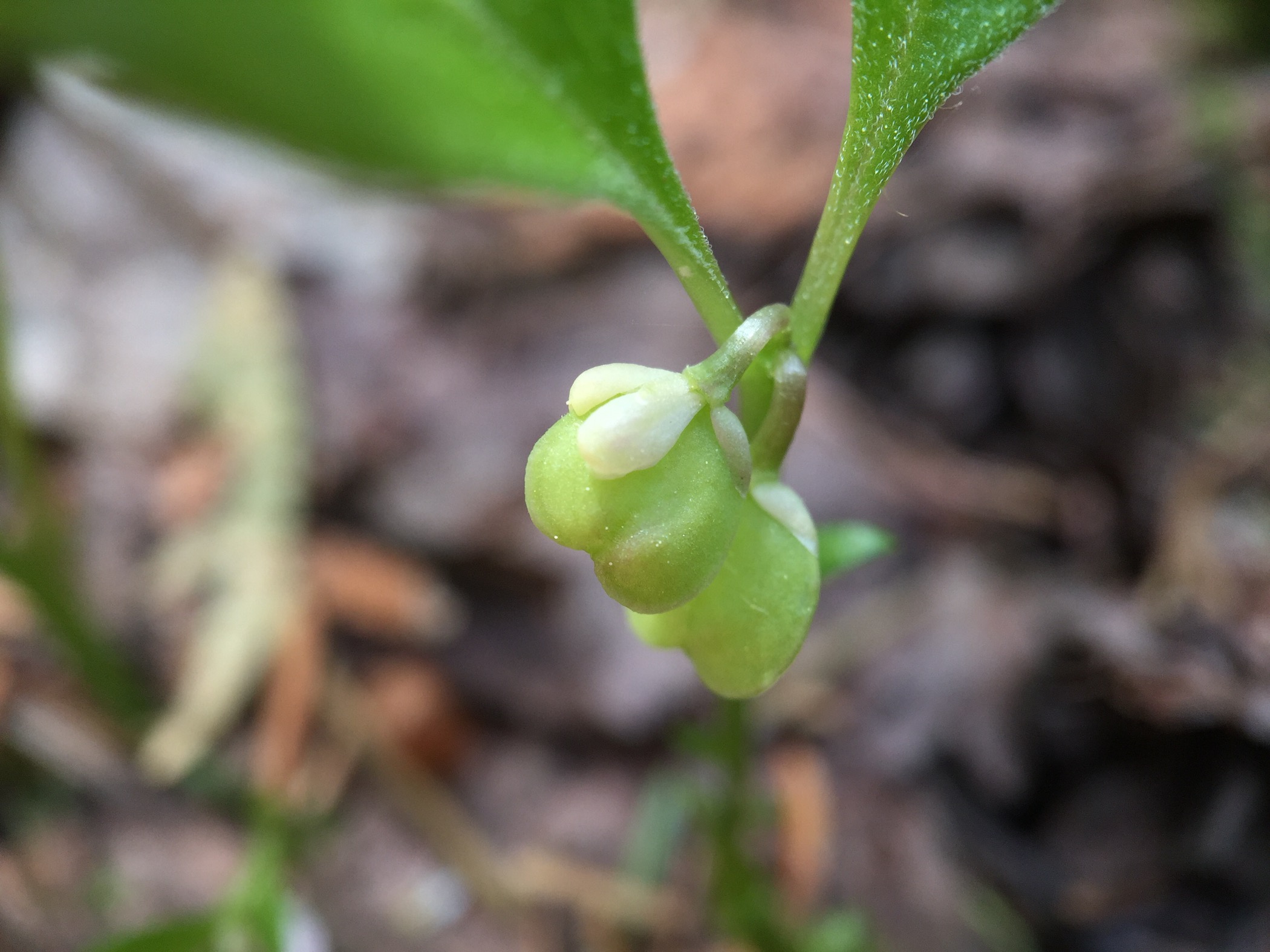 Many woodland plants spread vegetatively, which means that quite large populations can actually be derived from a single plant and are thus genetically identical. (Without comfirming, I believe there are aspen groves out in ?Wyoming? that cover square kilometres and are demonstrably one interconnected plant. I believe that large-scale cloning is also true of our Large-toothed Aspens.) If that vegetative growth is combined with a genetic requirement for cross-pollination (to create genetic diversity), then plants need some kind of fallback strategy. One such strategy is cleistogamy – “hidden seeds”. In Gaywings (Fringed Polygalas, Polygala paucifolia), stands of plants will produce sterile-looking stems with small flowers that never open and yet produce seeds. We found them today, after Thorpee alerted me to look for them! (I believe this was the topic of his Master’s thesis.)