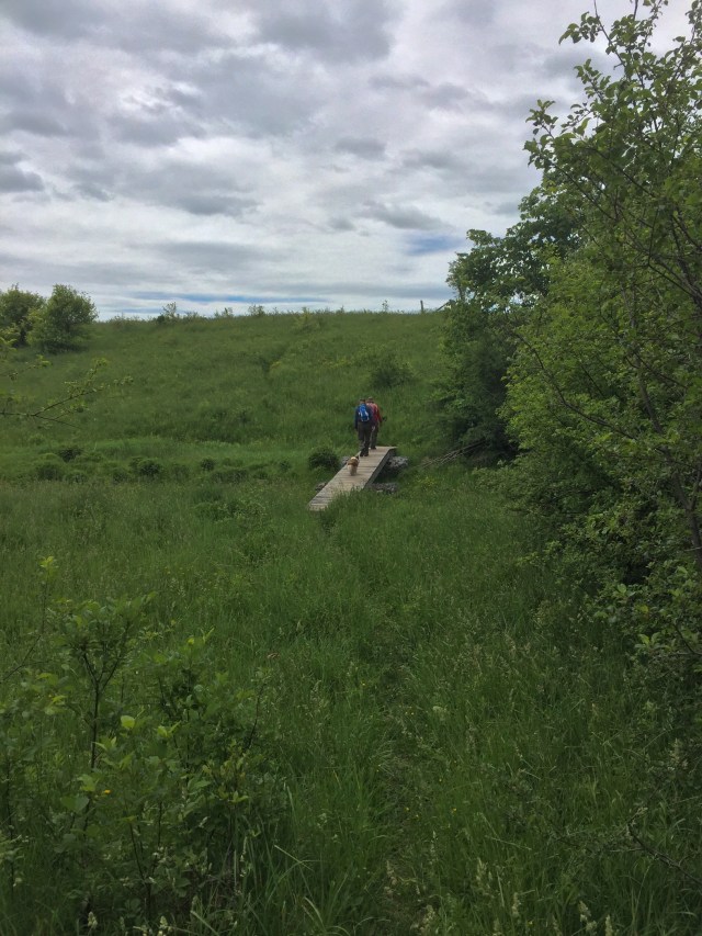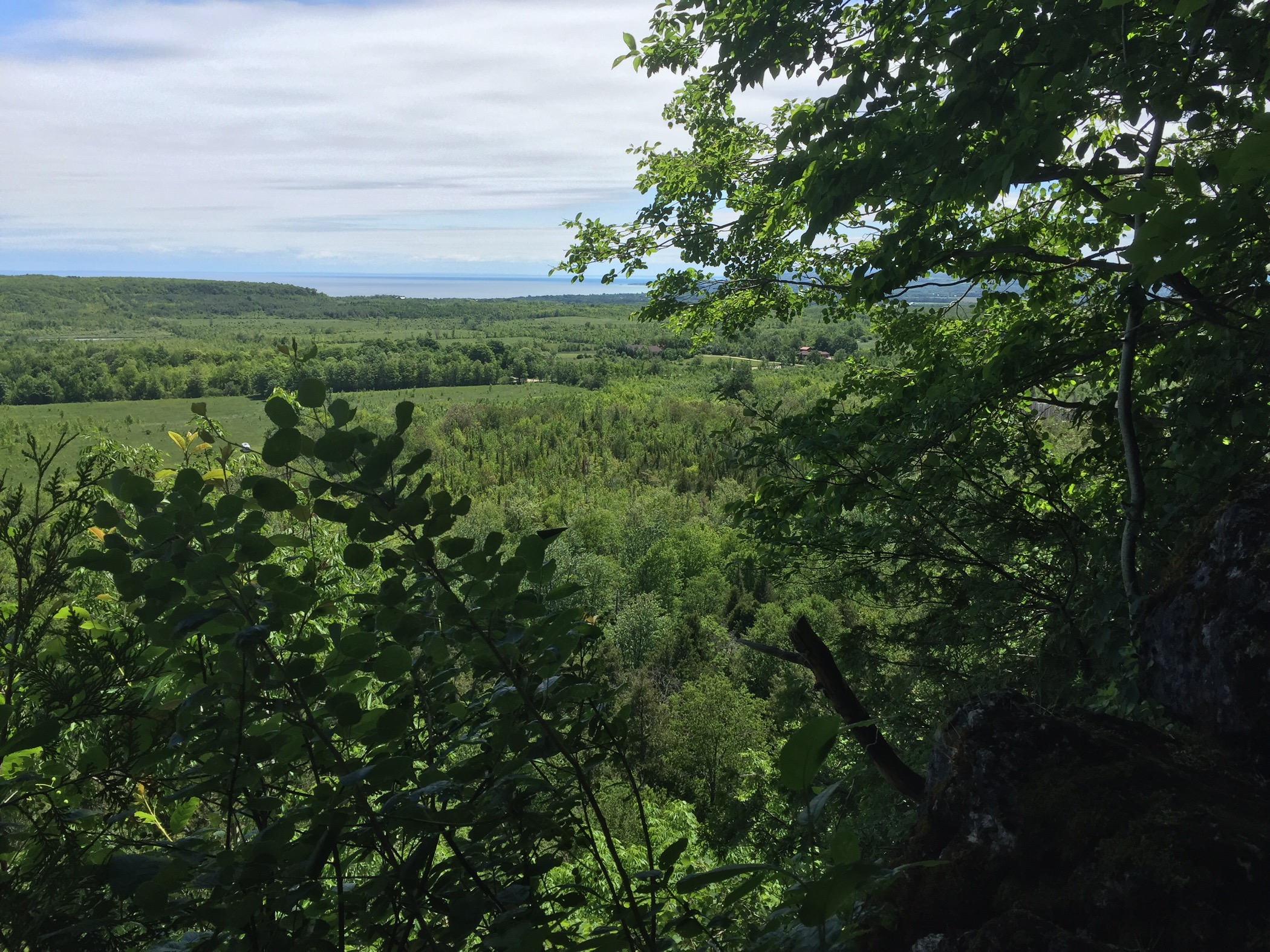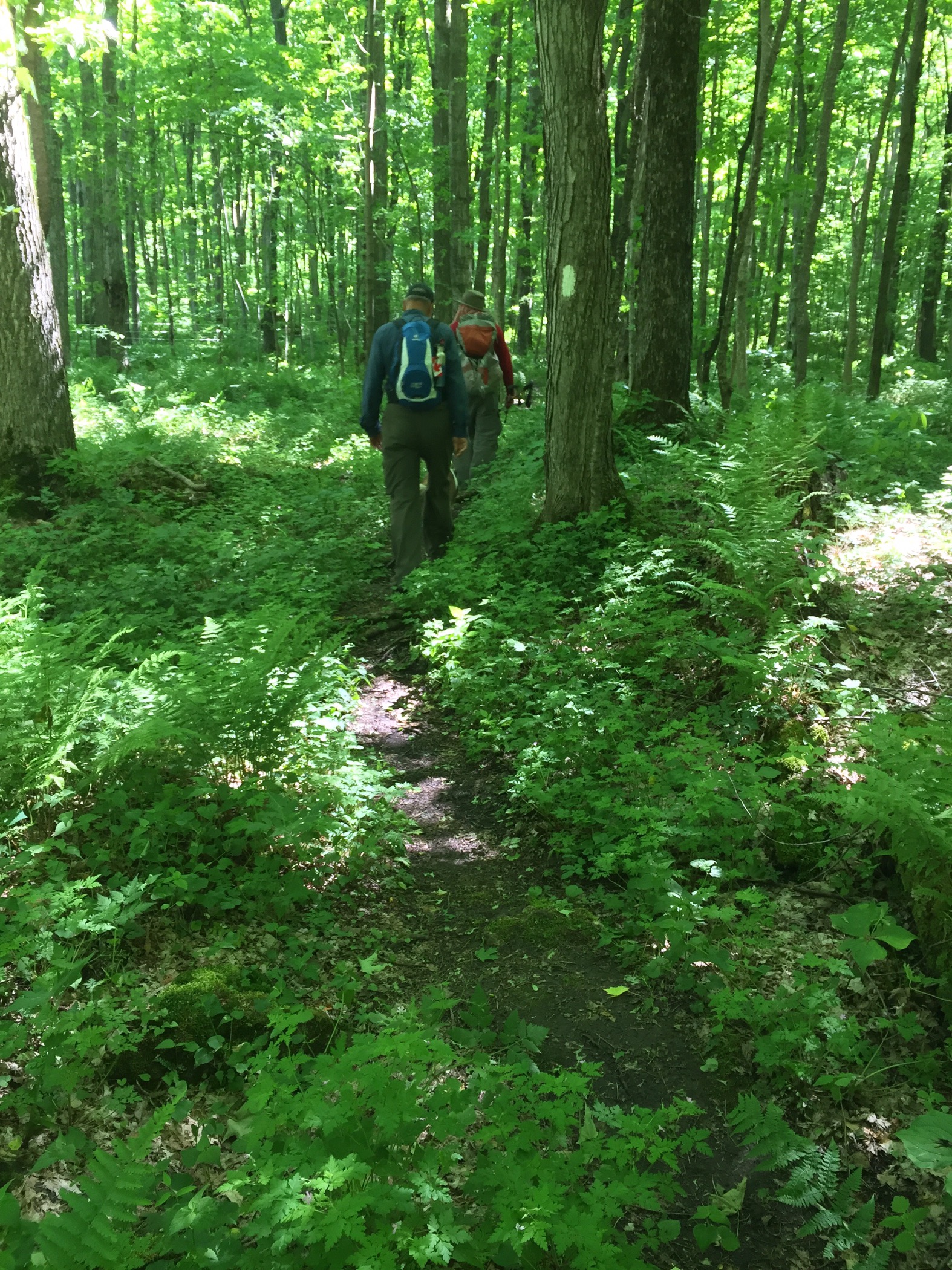 Today, we flew along the Trail through the Bayview Escarpment east of Owen Sound. What seems like eons ago — and was actually less than two weeks ago — we skipped some 13 km in order to make it all the way to Owen Sound. Today, on the way home from Tobermory, we completed that portion. David, one of our amazing Trail Angels, and a hard-working volunteer for the Beaver Valley section to the south, joined us. Kookork emptied his pack before starting, and we carried only water, a few snacks, and a first aid kit. He carried half the distance, and I carried the last portion.