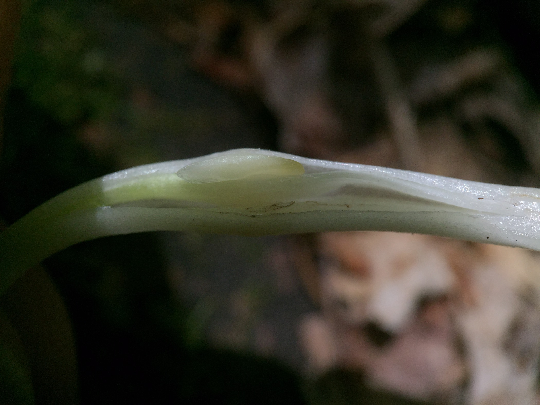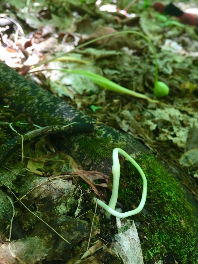 • Note the fruit of Trout Lily in the background. Note especially the bulbous swelling along the sprout.
