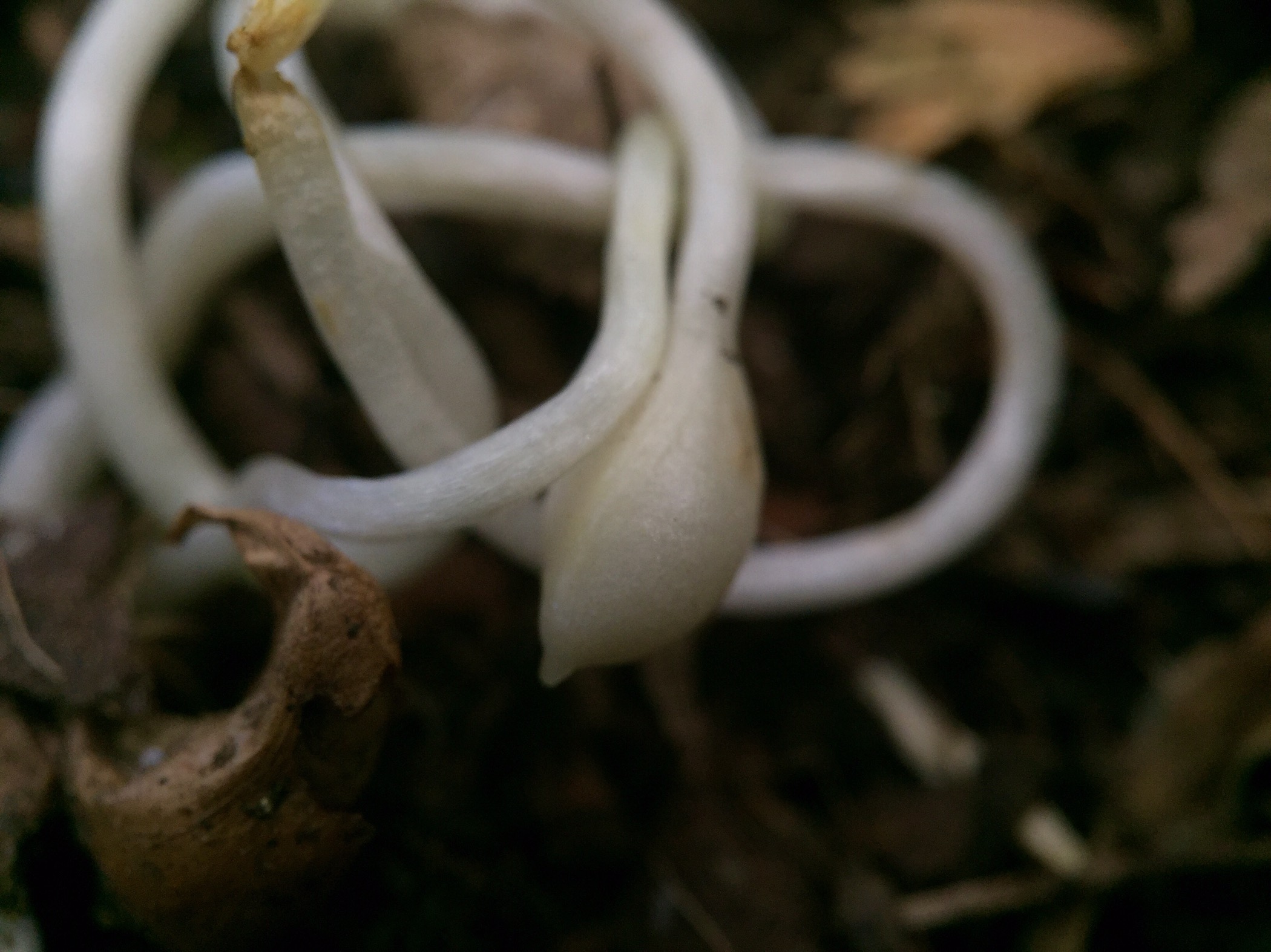 • With David’s help I made some progress on deciphering a phenomenon I’ve been aware of for years but never understood. In late Spring, I’ve seen strange root-like white pencil-lead-thickness growths curling up out of the soil and then down again into the soil. They look like bean sprouts.