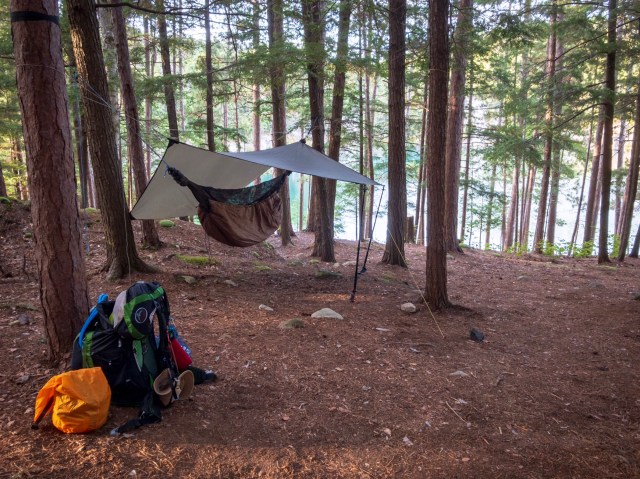 I’m struggling to stay awake, cosy and almost too warm in my hammock and quilts at 7:50 P.M. We left Orangeville at 6 A.M. this morning; got some wonderful whitefish and chips at Halbert’s on The Channel in Killarney; and back to sign in at the Park and be out on the trail shortly after noon. By 4:45 P.M. we were at the stunning Topaz Lake nestled up in the southern Killarney Ridge of the La Cloche Range. 14.7km, mostly easy, though ‘The Pig’ portage up and then over to the campsite on Topaz Lake was A PIG …