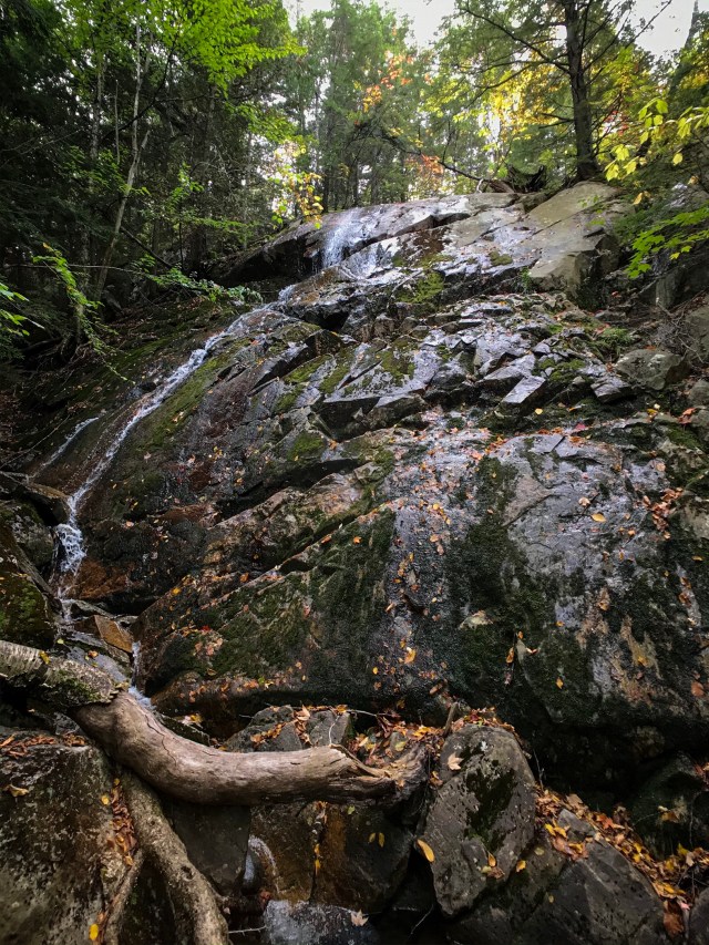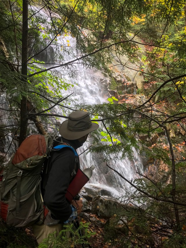 Here’s a photo of a lovely little waterfall tumbling off Silver Peak at 2 P.M. on our way up, and then at 8 A.M. the next morning after the heavy rains as we headed down. Hard to believe this is the same falls!