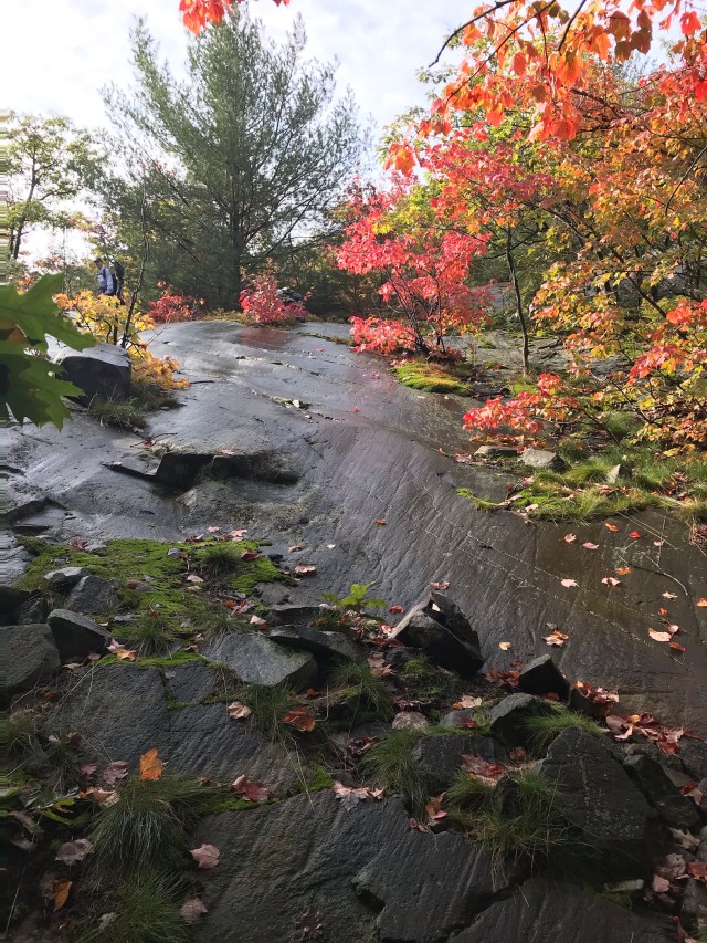Lots of mostly short ups and downs today. I don’t think they’re nearly the height nor the steepness of those along the north-western portion of the trail. Nevertheless, they come frequently. The wetness makes even the bare quartzite slippery, so we had to be very careful with every step across the open rocks.