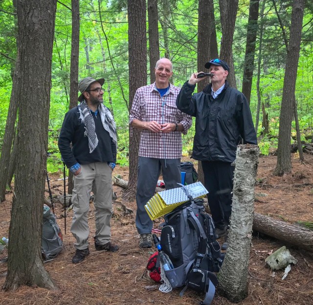 We passed The Rock, the infamous place where I fell last autumn with Ron, ending our hike. We celebrated with a toast to Ron and to the experience (with something Ron presented to me expressly for this event). We were a bit groggy for the next hour or so … (Fortunately this section of the trail was quite simple.)