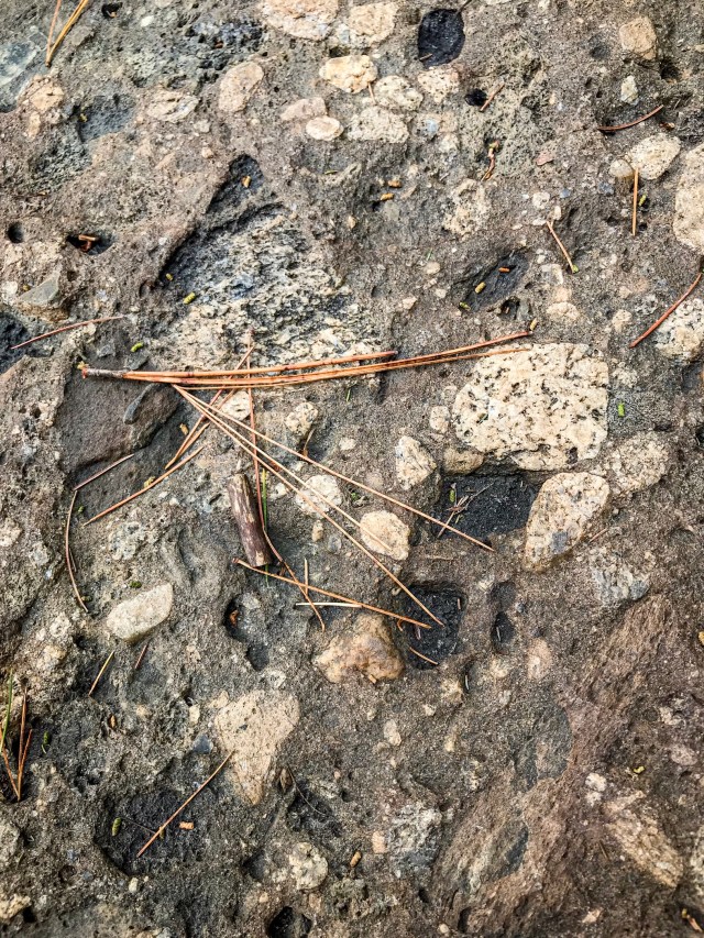 We walked over a small room-sized patch of unusual rock today, just as we were chatting about the value of hiking slowly. (We’re good at both of those things: chatting, and walking slowly.) The idea of the conglomerate struck me as highly appropriate. Here were multiple types of pebbles of various sizes, and all rounded as if laid down in a gravel bar in ariver, probably over 2 billion years ago. (2*10^9 years ago!). Some obviously granitic, some gneiss-er, some dark and fine-grained. All imbedded in a quartzite matrix. Here also were three hikers, some large, some less so; all somewhat rounded by the experiences of life, all embedded in the shared matrix of hiking together and sharing the Killarney experience.