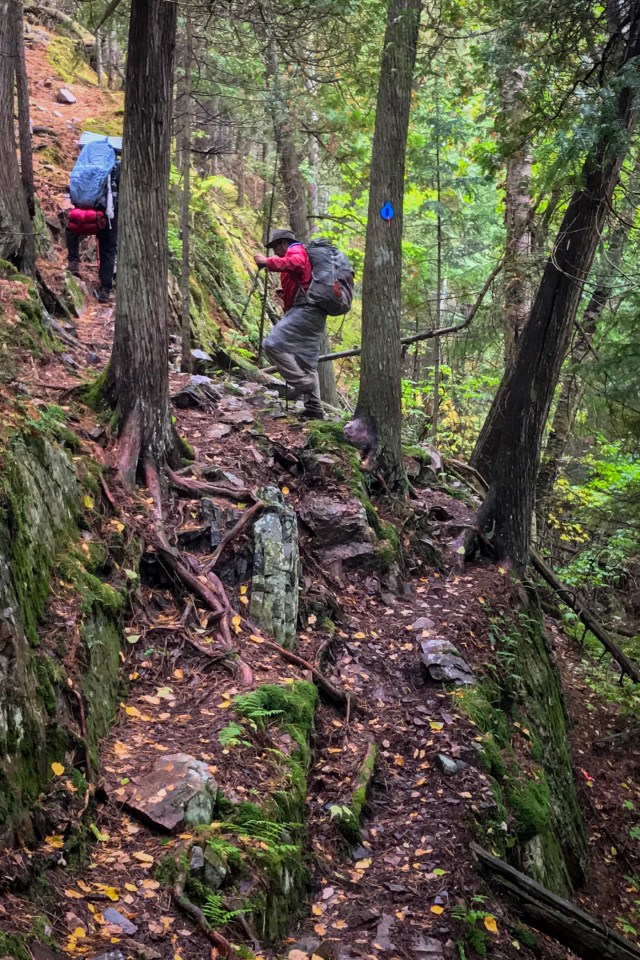 Despite this section of the trail being mostly flat, there were some good challenges along the way. Several short climbs and descents; lots of wet hemlock roots; many places to carefully plan the next series of foot and hiking pole placements …