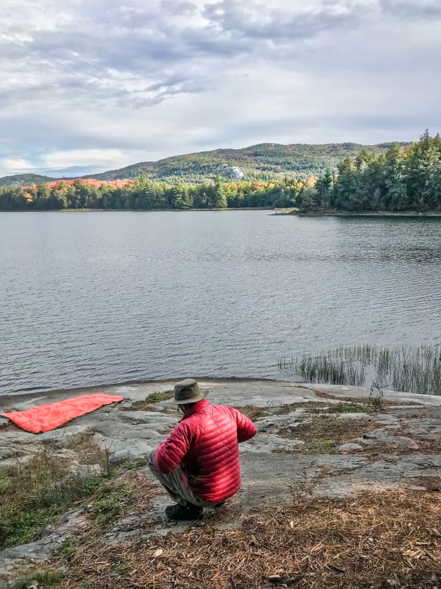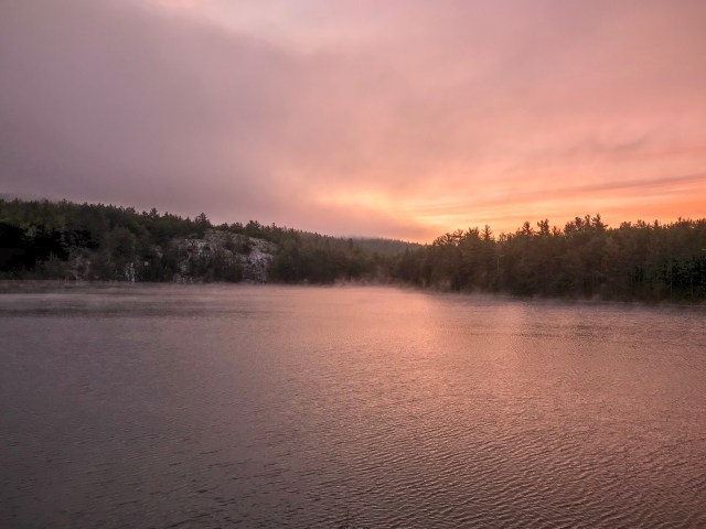 It was beautiful sunrise across Shigaug Lake with high pink clouds under-brushed with pink fog swirling across the lake. And it has been a wonderful sleep, finally down to temperatures at which my top quilt was designed for.