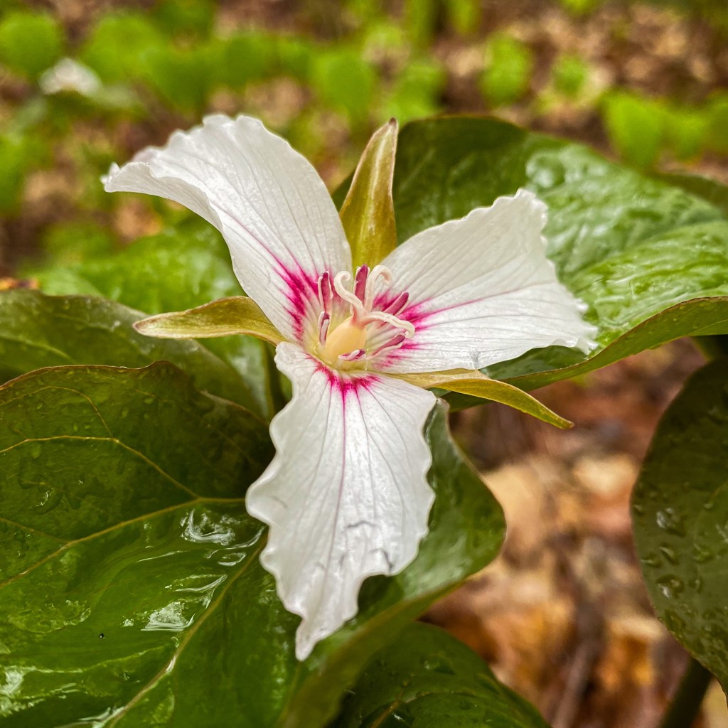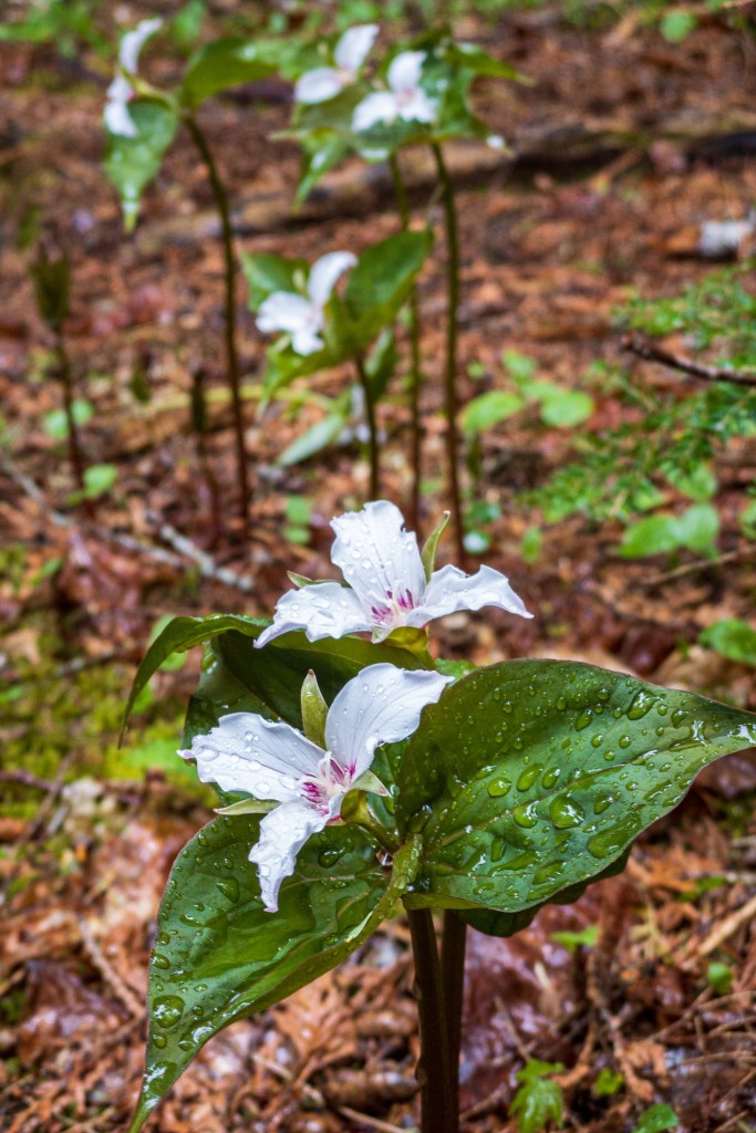 There were spectacular clumps of Painted Trilliums along the portage, dripping in the rain, with their much darker green leaves than either the White or Red species. I’m almost ashamed that I’ve never knowingly seen Painted Trilliums before. My excuse is that they are scarce in the areas I know best, where White Trilliums are by far the most prominent, especially in the recently-grazed forests so common in Southern Ontario farmlands.