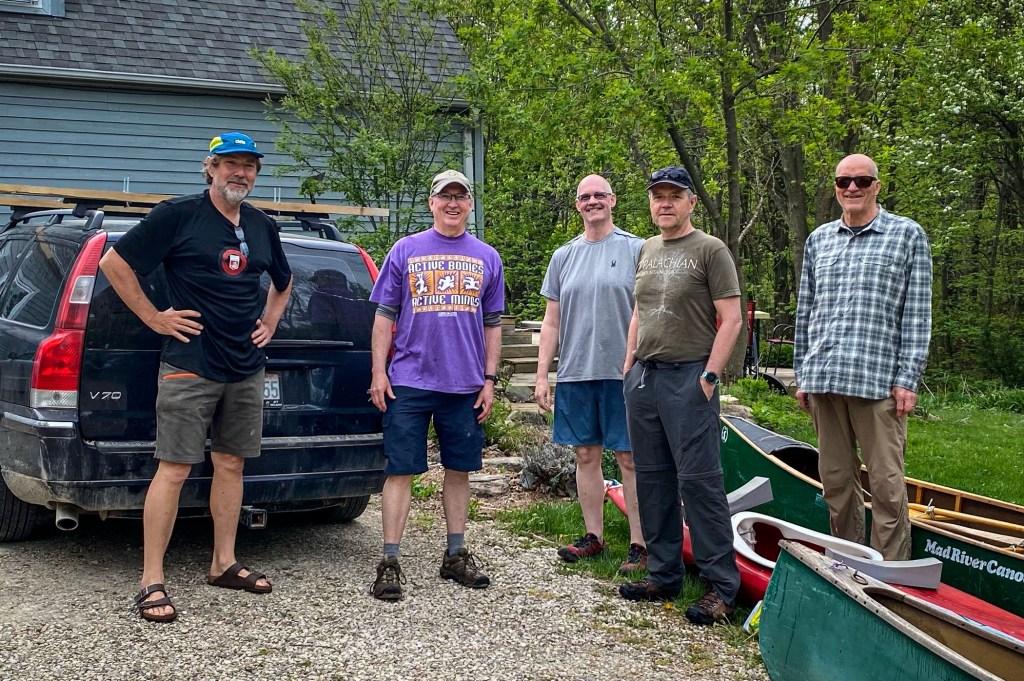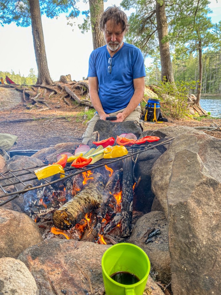 We gathered at 7:30 this morning at Ron’s place outside Orangeville, loaded the two cars with two canoes & one kayak, and headed off in to the sunny warm day. A quick take-out lunch at the Farmer’s Daughter in Huntsville, and to the Rain Lake entry point just after noon. Loaded into the boats and off down the narrow lake with a decent tailwind, certainly enough to clear the blackflies. An easy paddle, and remarkable dry easy short carries. At the campsite on the north shore of Jubilee Lake just after 4 P.M., tents up, firewood gathered, and Ron put the veggies on the fire to grill, ‘found’ a box of fine red wine in the lake, and put the pork chops over the coals. A fine first-day dinner!
