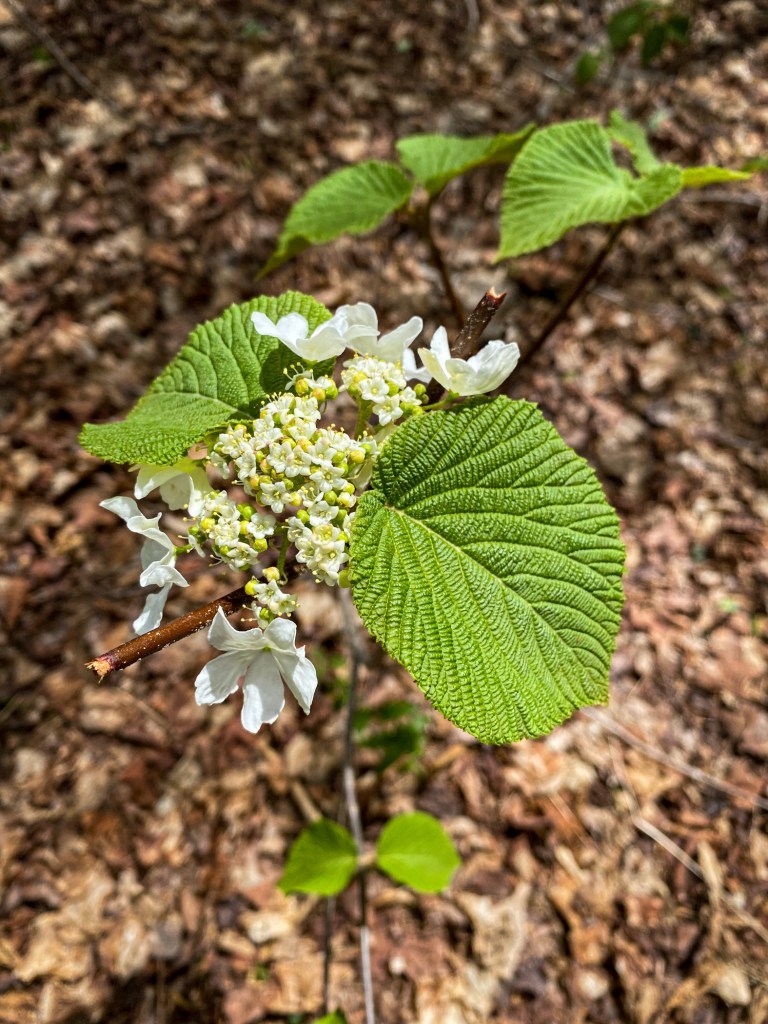 Hobblebush, Viburnum lantanoides, with the large sterile outer flowers. I am fascinated with the deeply wrinkled young leaves. The young expanding leaf buds are even more striking!