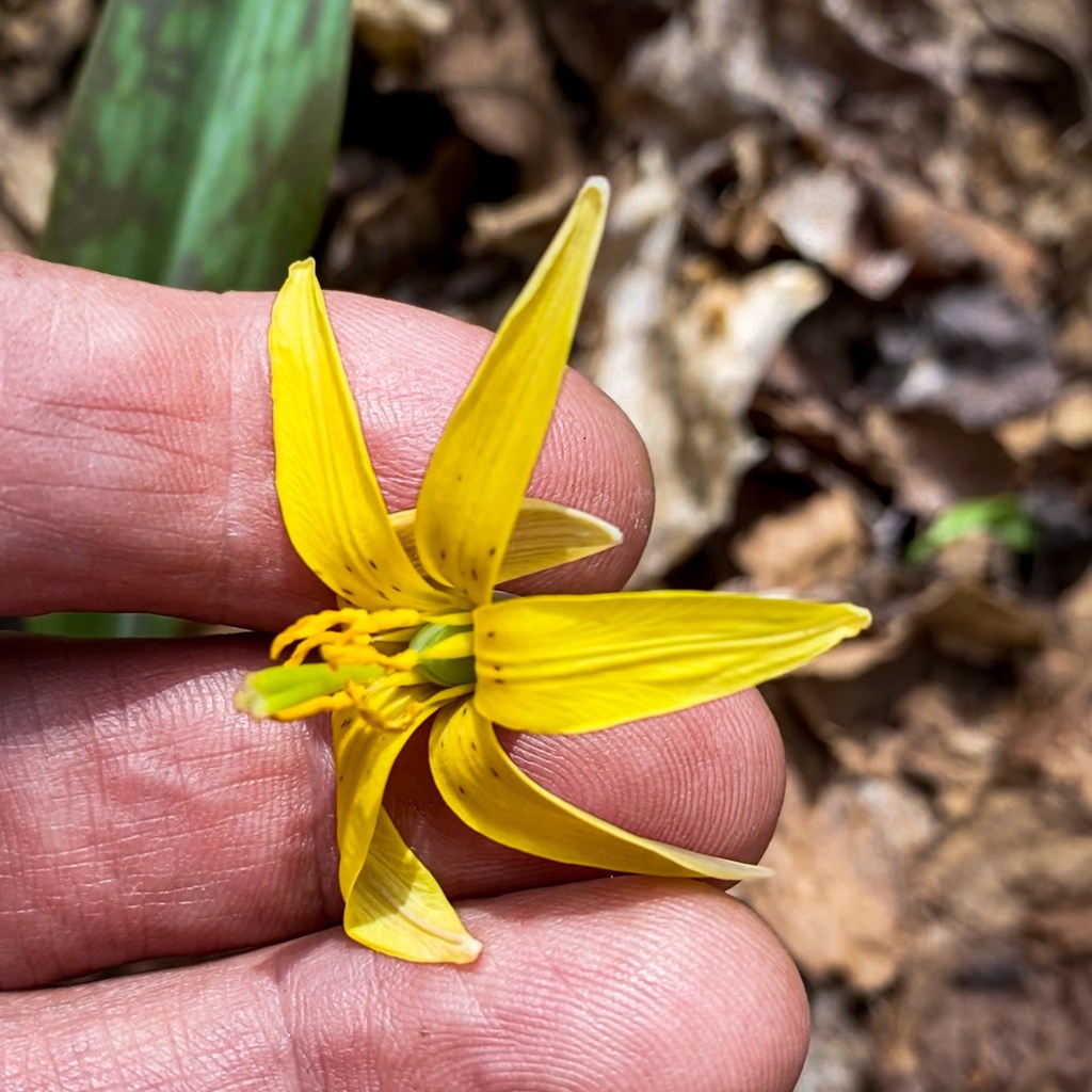 Yellow stamens of Trout Lily, Erythronium americanum. (There are at least two colours of stamens, this yellow, and another, more orange-red. These different colours may attract differing insects for pollination, though this is only recently been studied.)