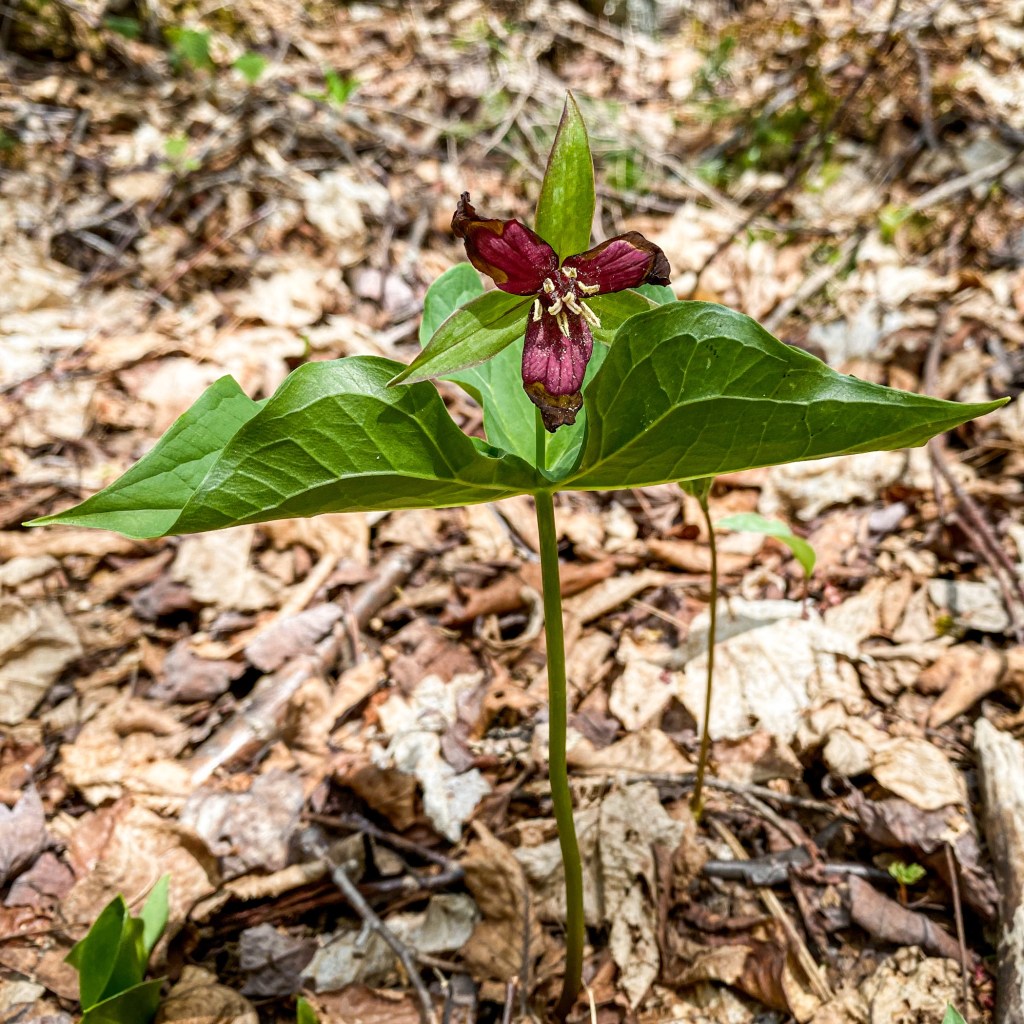 Red Trillium, Trillium erectum. Beautiful, except for the smell of rotted fish which attracts flies to trick them into pollinating.