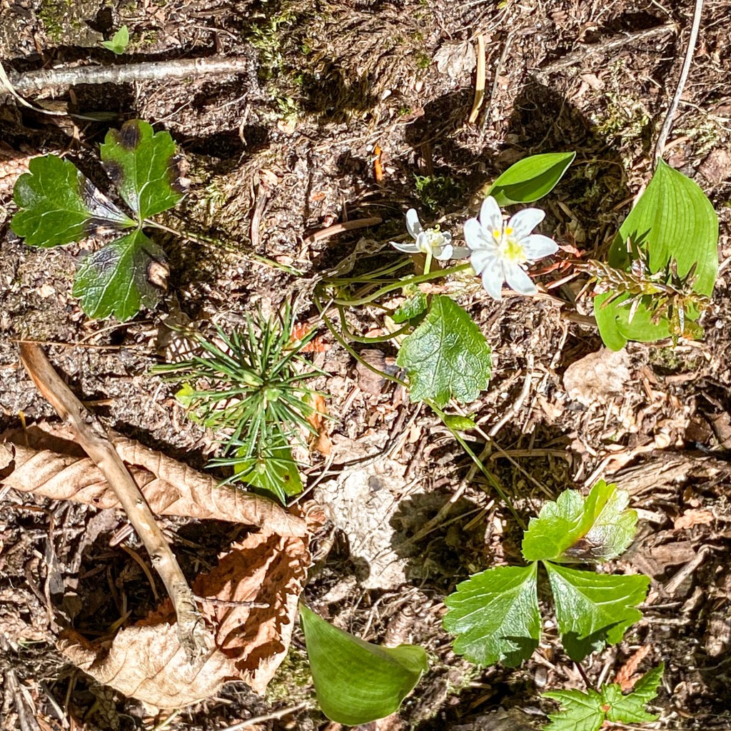 Spring is bursting out all over up here. The tree canopy is gilded by that warm yellow-green translucence of the season. Red Trilliums are very brightly backlit by the barely-filtered sun. Trout Lilies (yellow stamens) are even finishing on the dry forest floor! Carolina Spring Beauties are everywhere along one of the portages. Lots of Goldthread in flower; some Rose-twisted Stalk, and Hobblebush (with the larger outer ring of flowers around the edge of the flower head) in flower as well.