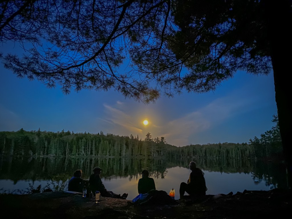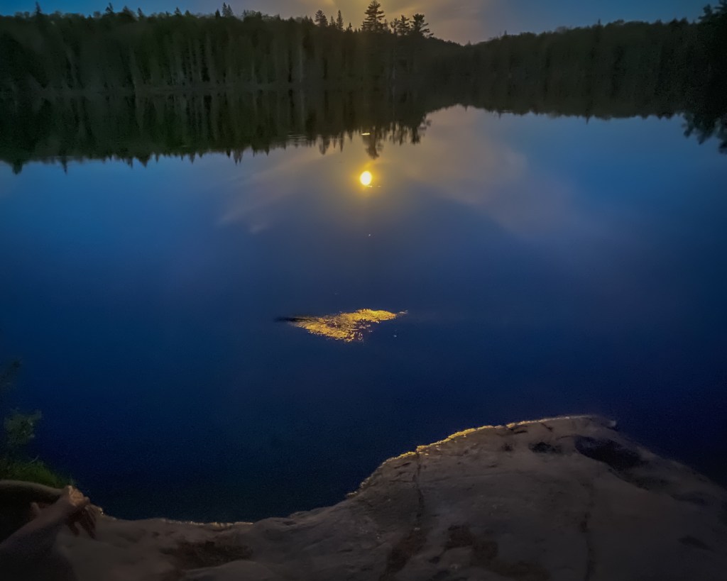 Actually … the skies have remained remarkably clear. The full Moon is rising over the glassy water. Only a few Whirligig beetles stir the calmness. And one possible otter. I went out and sat with the rest as we watched for the eclipse to begin. Saw a great passage overhead by the ISS. The eclipse didn’t visibly begin to happen, so about 10:30, we all turned in.