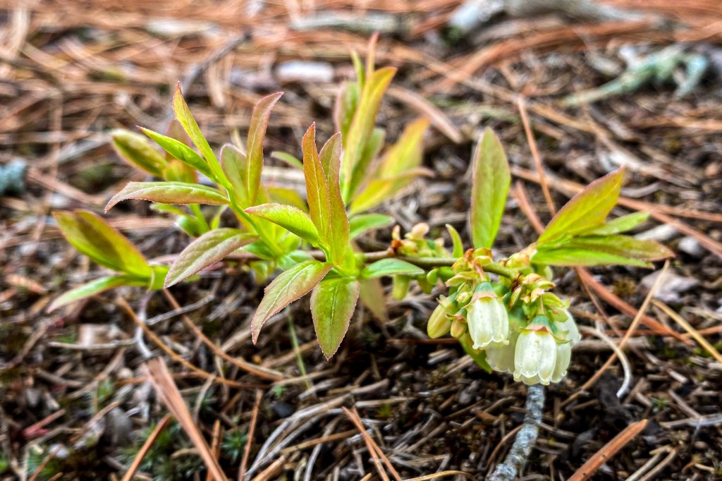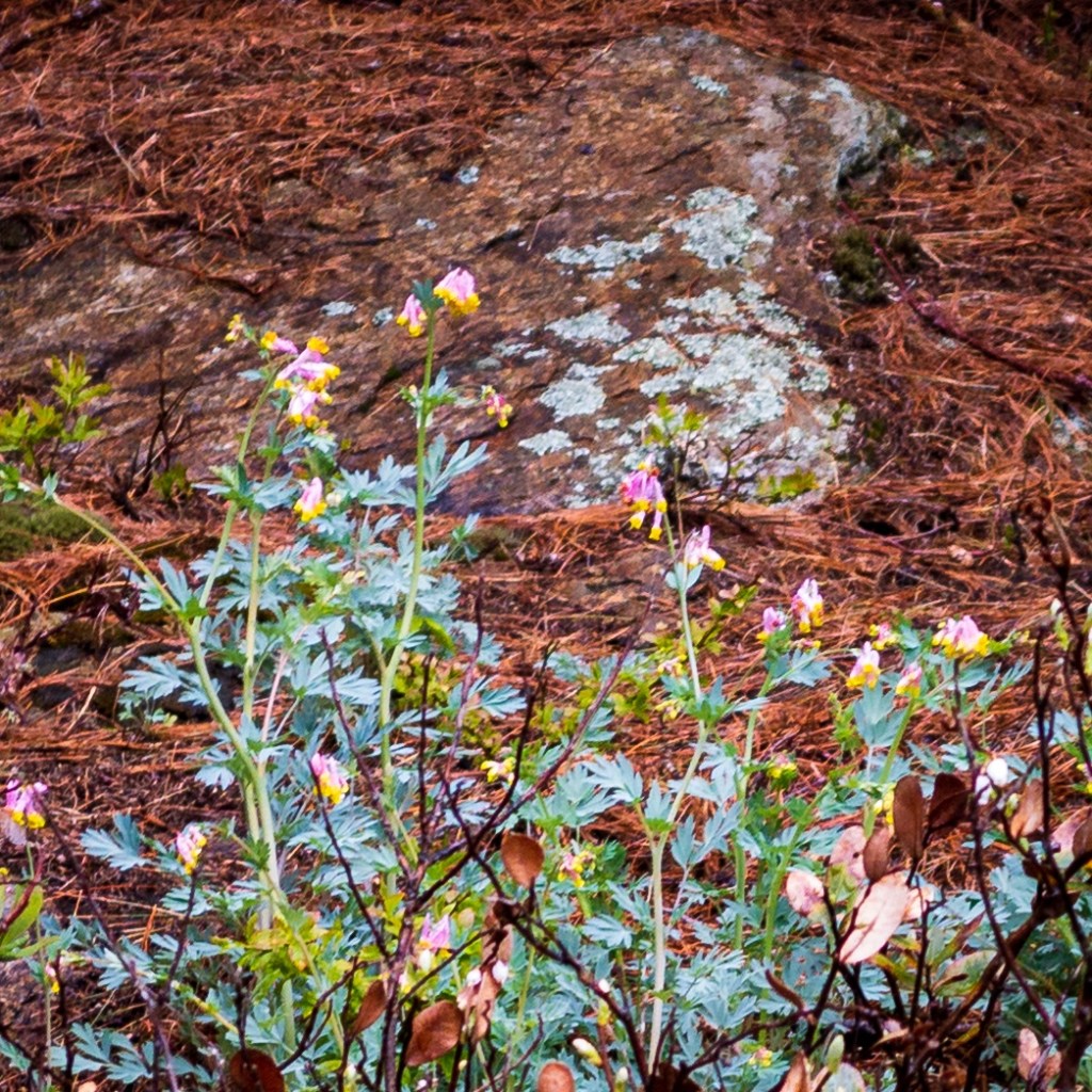 Passed a clump of pale pink and yellow flowers while paddling along the north shore of Muslim Lake, and thought Corydalis — but surely couldn’t be this early in Spring, so Ron and I swing the canoe around. Sure enough, there was Corydalis sempervirens, Pale Corydalis (or the fine name Harlequin Corydalis), growing in a small clearing along the south-facing shoreline!