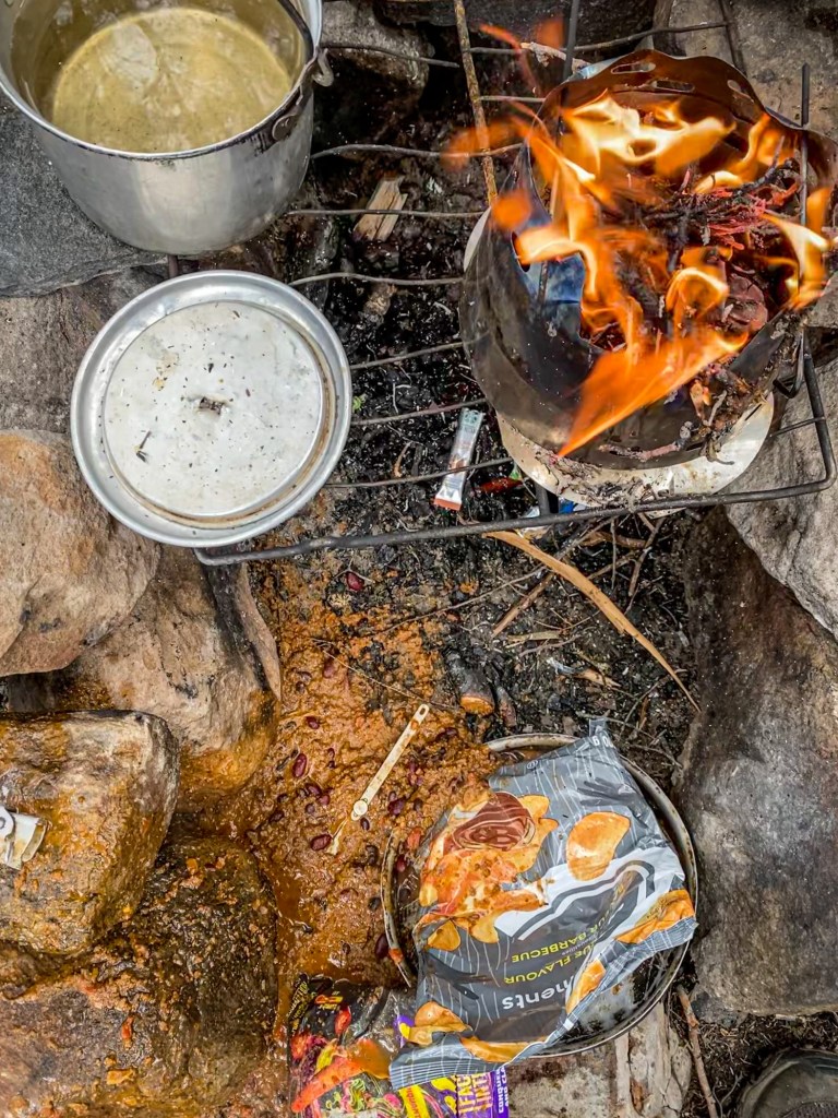 On the Jubilee campsite (across from the campsite we used on the first night), it was my time to do supper, a prepared chilli that I had dehydrated. Things were coming nicely, nearly ready to serve having been heated up on my wood-burning stove. But I put too much wood in it, and as that burned down, it unbalanced the wide pot and the chilli instantly fell over the campfire area! I shall henceforth be known as something like ‘Chilli Drop’ Whitcombe …. (Fortunately, I still had enough chilli, and I carefully watched the pot as it simmered.)
